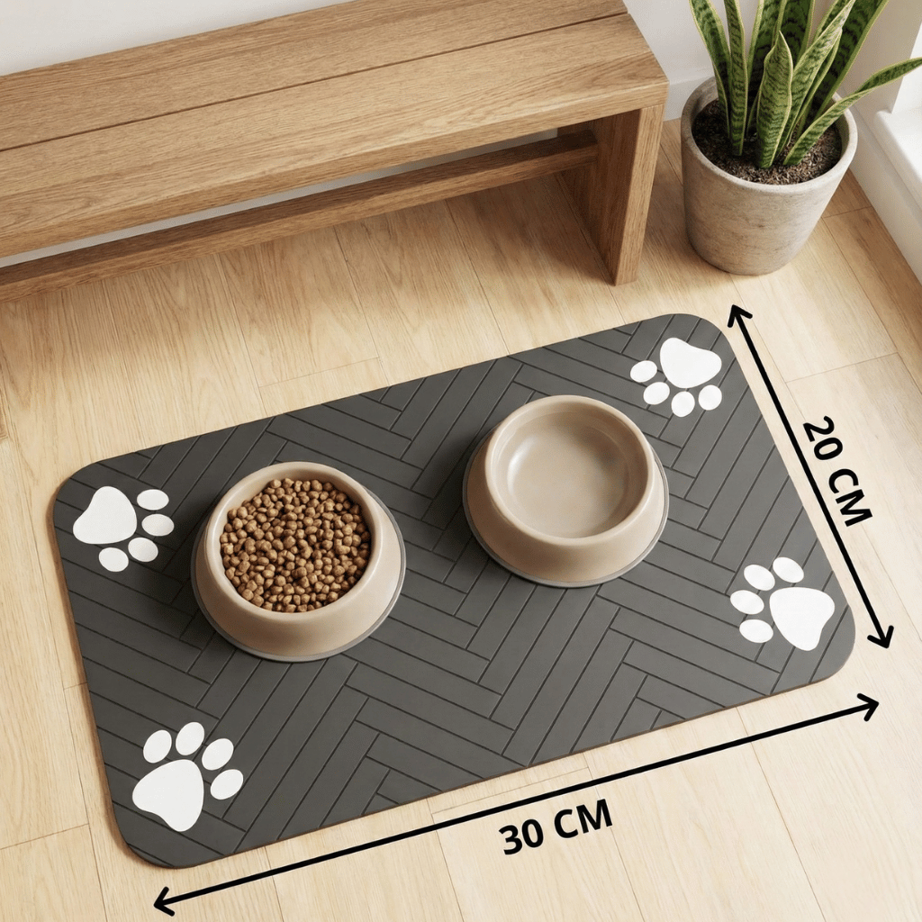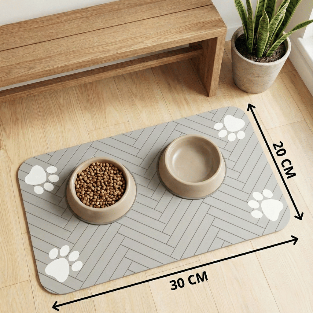 Use o tapete embaixo da tigela de comida ou água para manter o ambiente sempre seco e proteger o piso de respingos e sujeira.